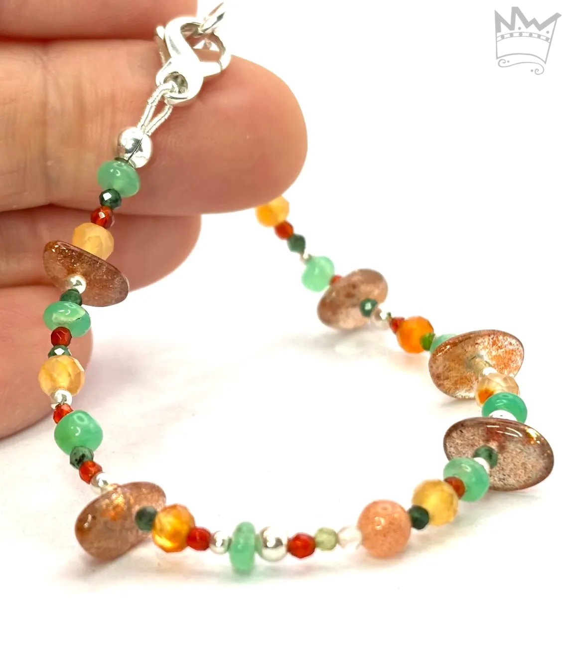 Ein außergewöhnliches Edelsteinarmband in unterschiedlichen Formen in Grün - und Orangetönen. Unterschiedlich große Silberkugeln sorgen für zusätzliche Glanzakzente.