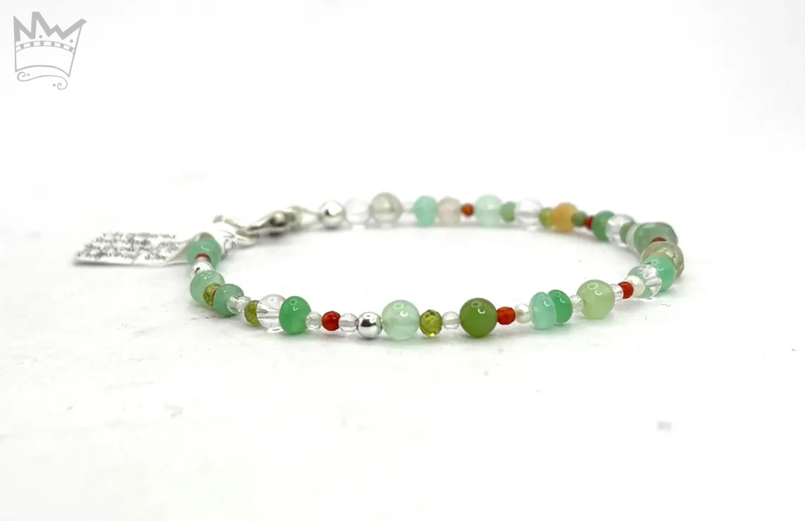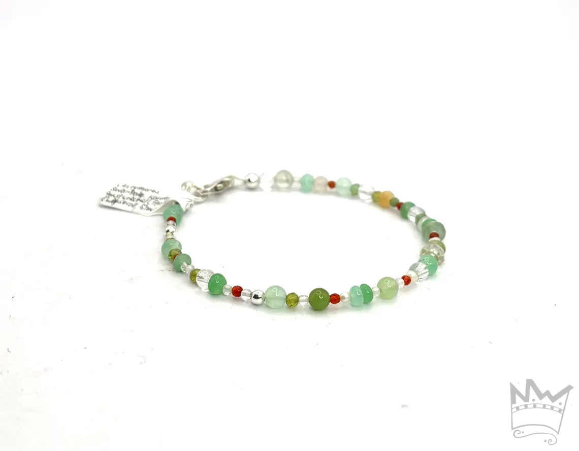 Ein feines, zartes Armband aus 6 verschiedenen Edelsteinen, Silberkugeln und Perle. Feine Grüntöne mit kleinen, roten Farbtupfern.