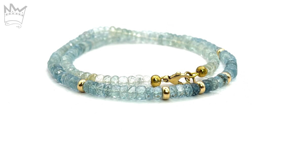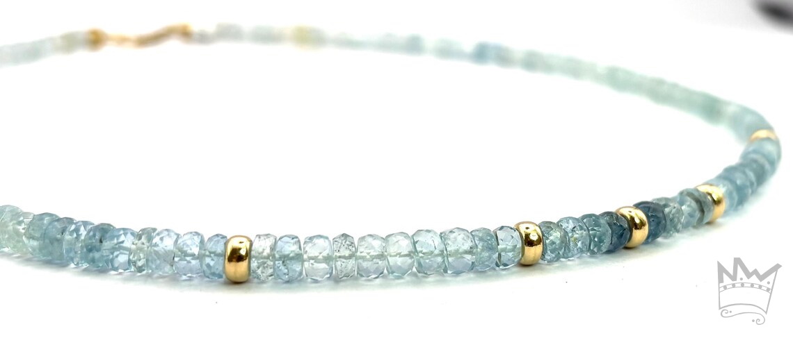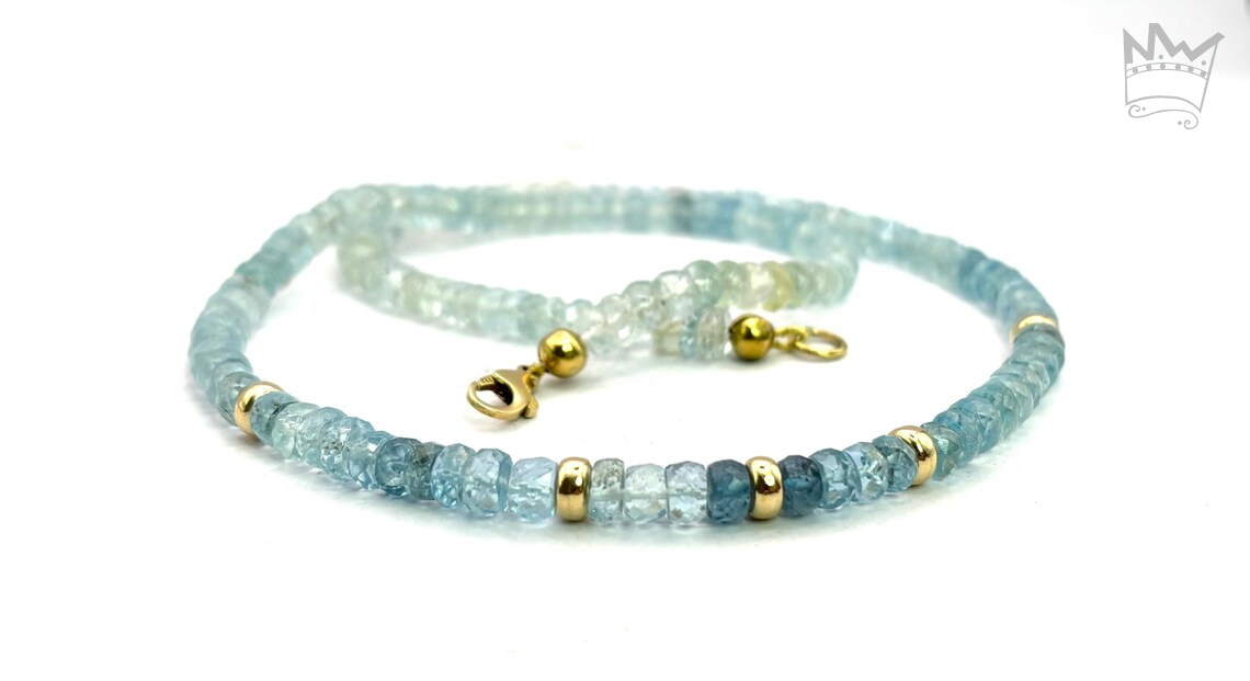 Ein sehr exklusives Collier aus facettierten Aquamarinrondellen im Farbverlauf. Im vorderen Bereich sind 5 Goldelemente in 750 Gelbgold eingearbeitet, die zusätzlich für edle Glanzpunkte sorgen. Als Schließe dient ein Karabiner.