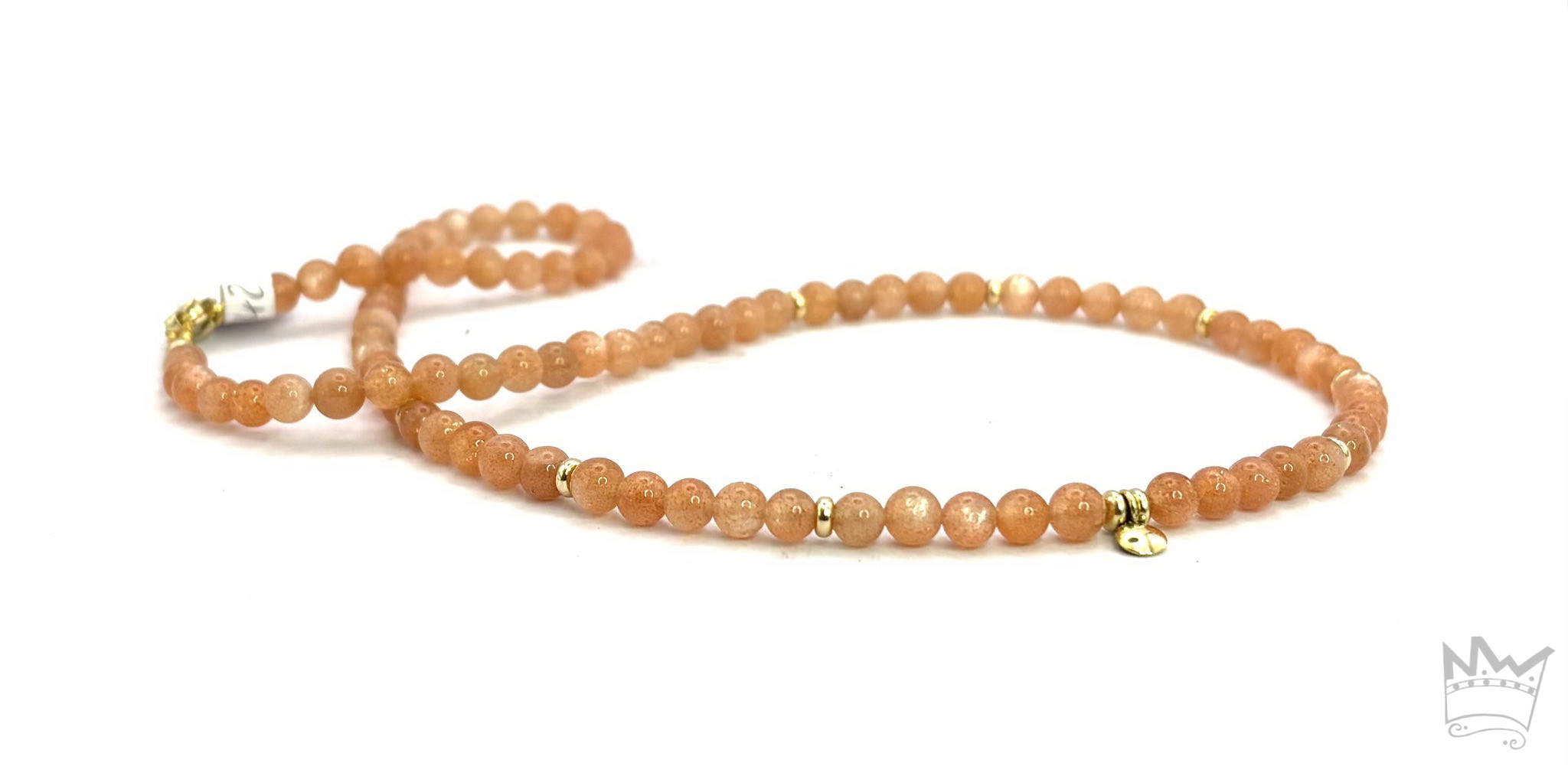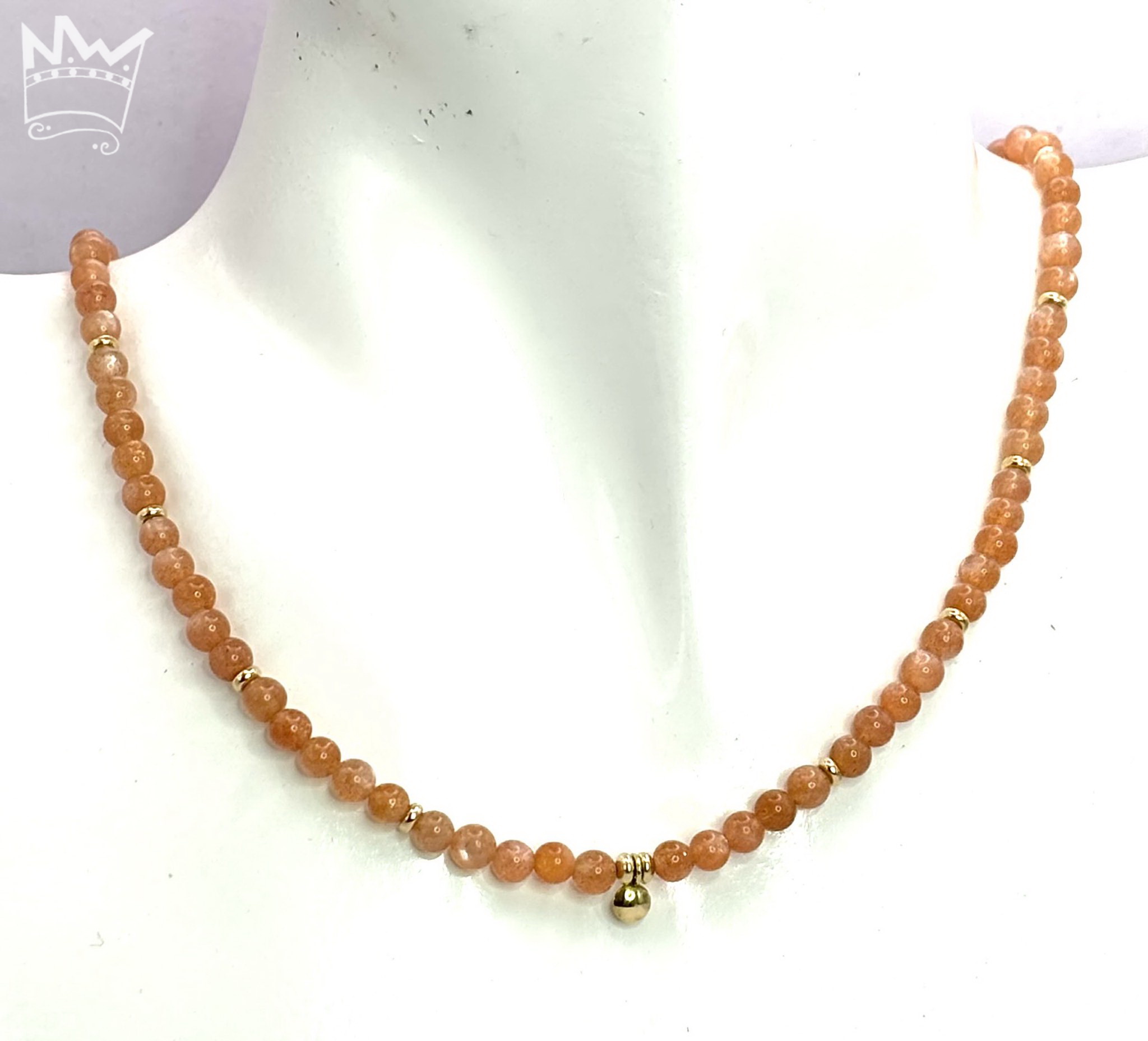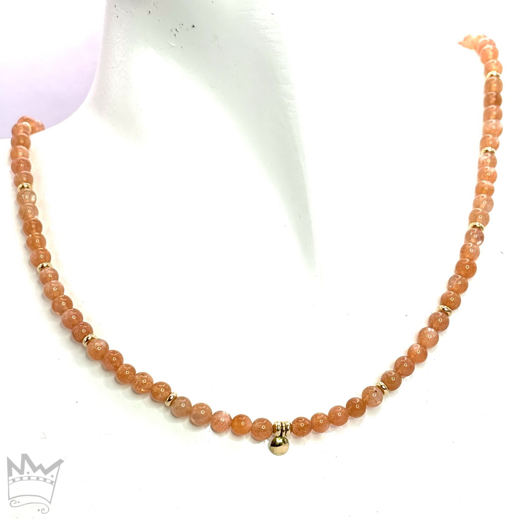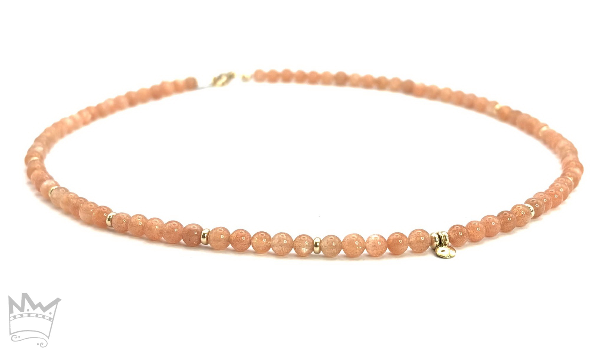 Den ganz bezaubernden Aspekt des orangeroten bis kupferfarben Sonnensteins, bilden die ihm innewohnenden kleinen Kupferblättchen; sie verleihen dem Stein sein feines, typisches Glitzern. Mittig befindet sich eine kleine Goldschale aus 14kt, massivem Gelbgold und im Verlauf der Kette werden die runden Perlen von insgesamt 10 zarten Goldringlein aufgelockert.