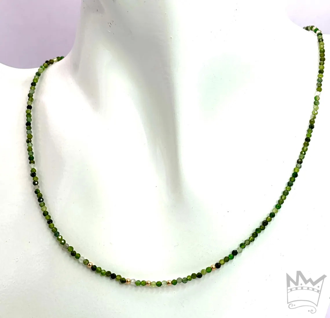 Eine feine, filigrane, edle Kette aus feinen, facettierten Turmalinkugeln in der für den Turmalin typischen, wundervollen Farbvielfalt. Im vorderen Bereich sorgen kleine Goldkugeln aus 18kt Gelbgold für zusätzliche, edle Glanzpunkte.
